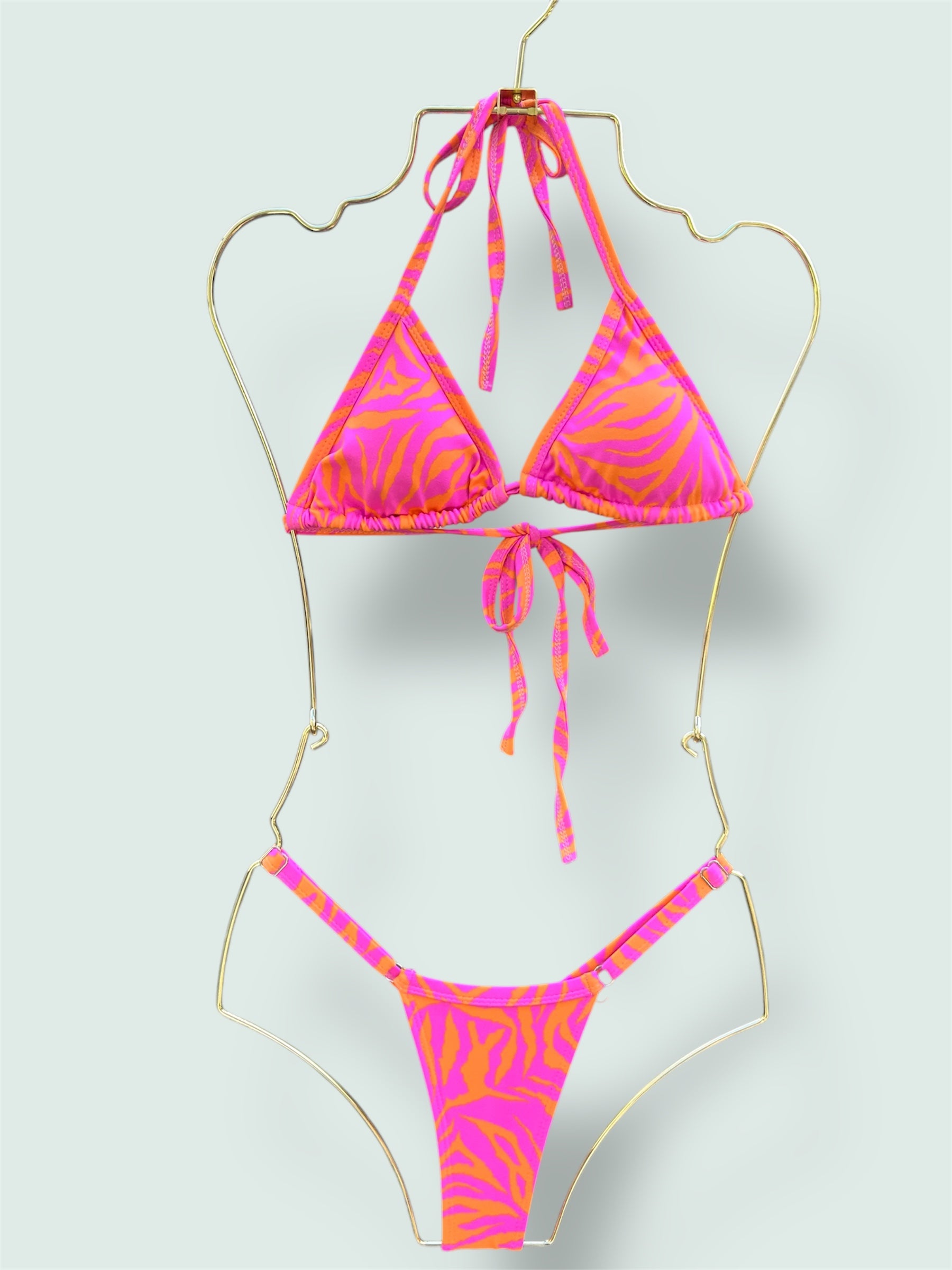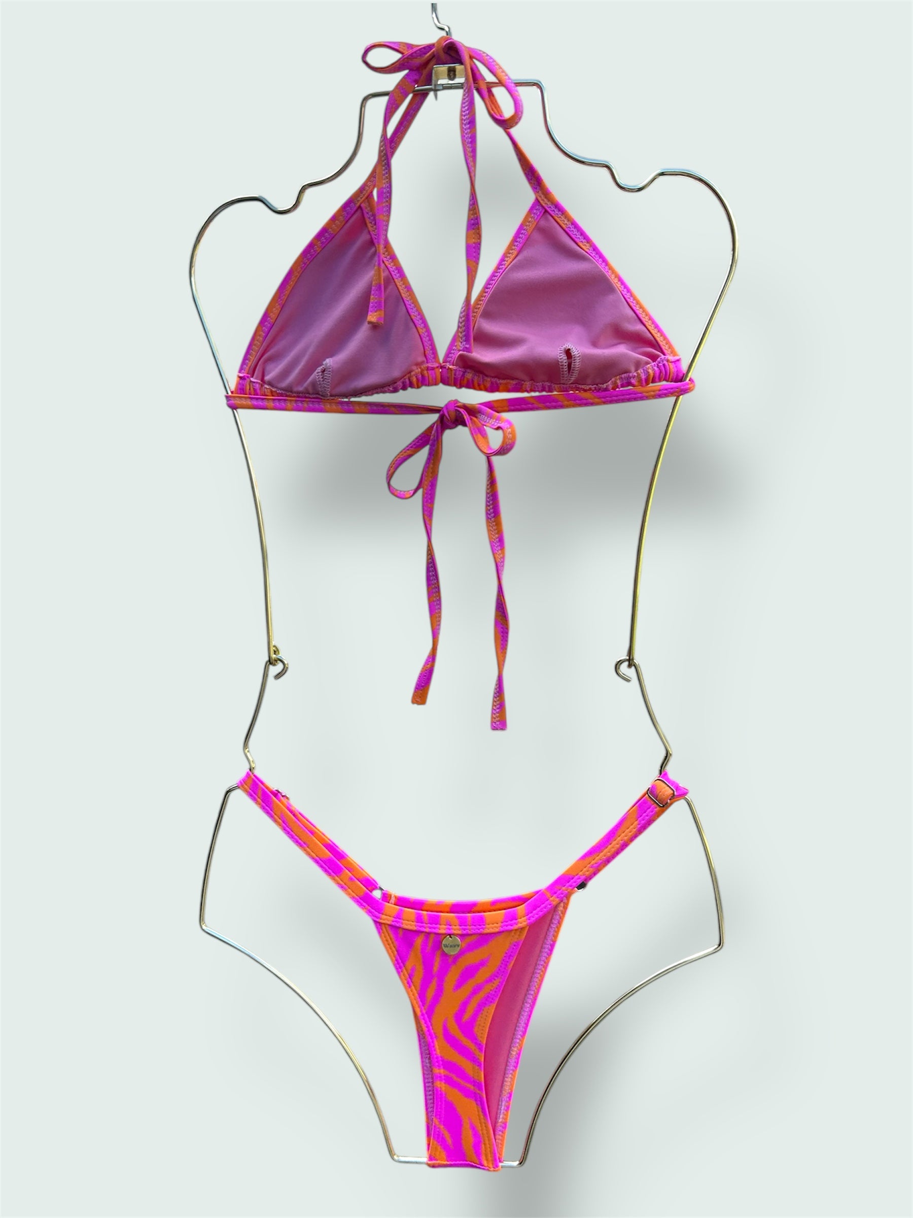 Conjunto de biquíni composto por top em formato triângulo e cueca tanga
