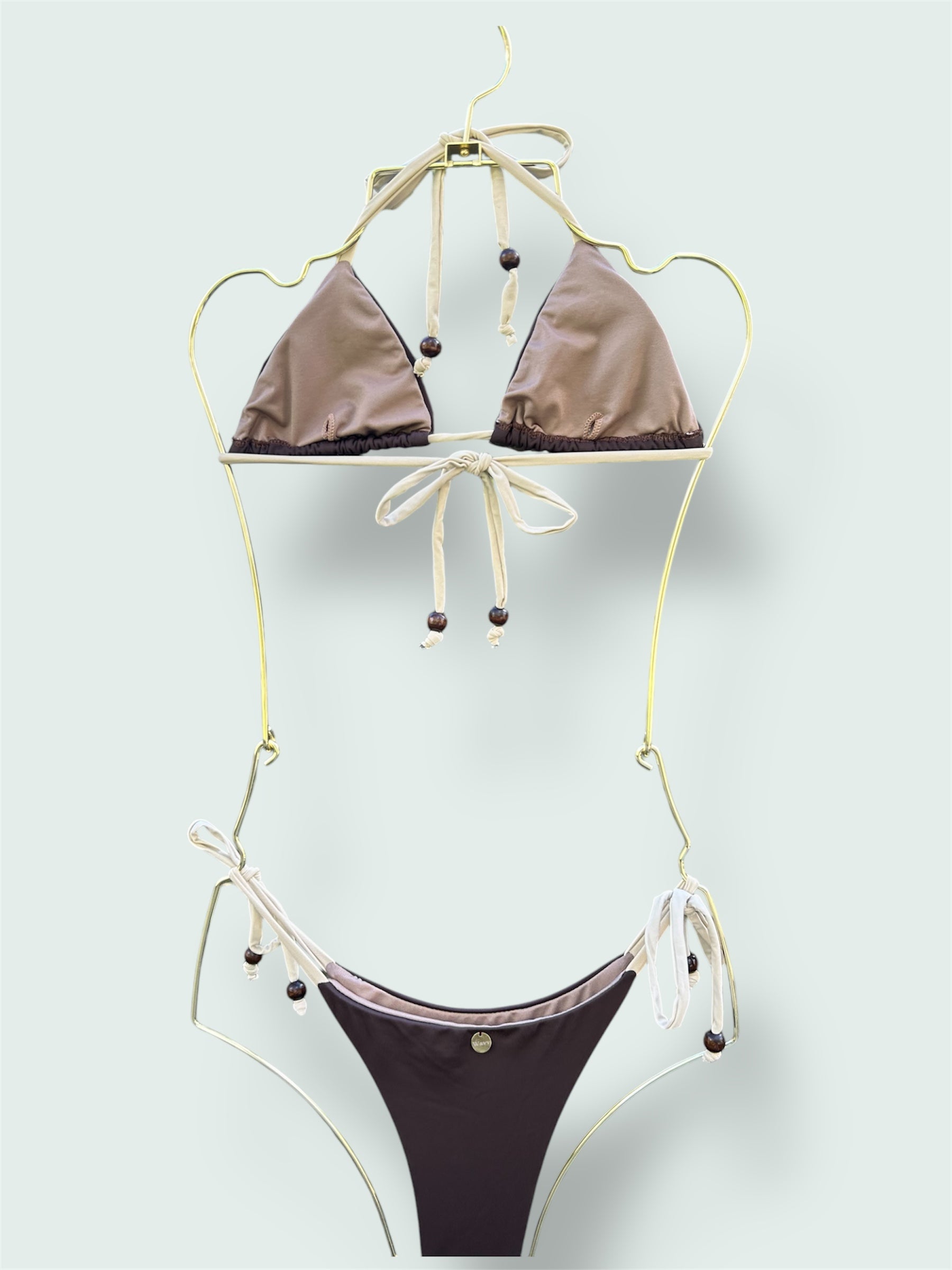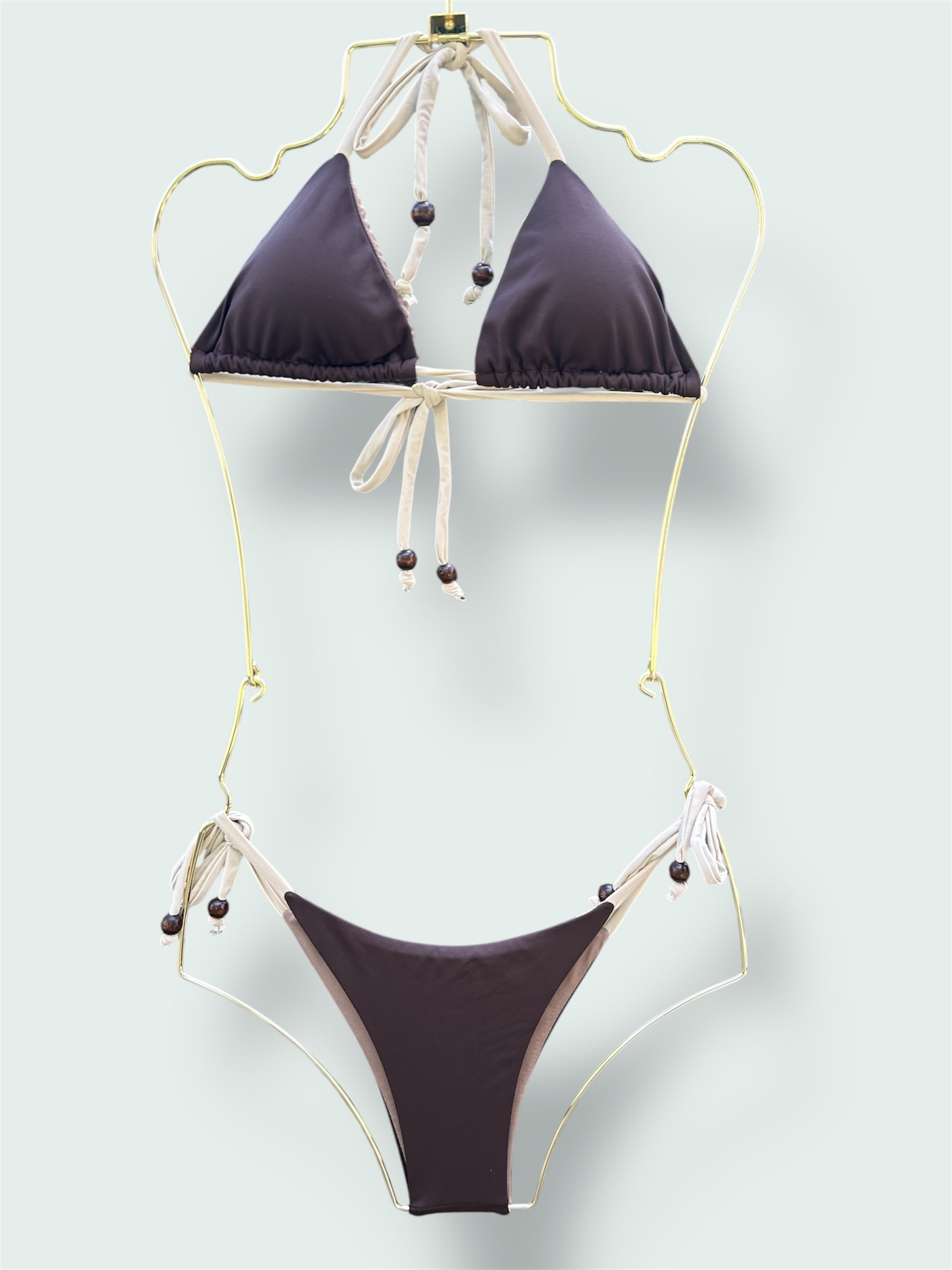 - Top com copas triangulares ajustáveis e alças finas de laço, permitindo ajuste personalizado